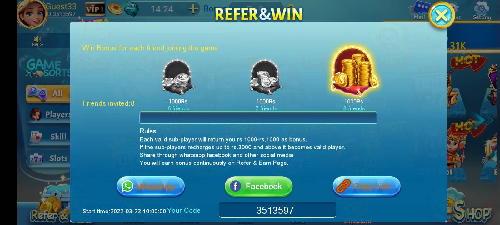 You get up to PKR 1000 for every friend who joins and plays using your referral code.